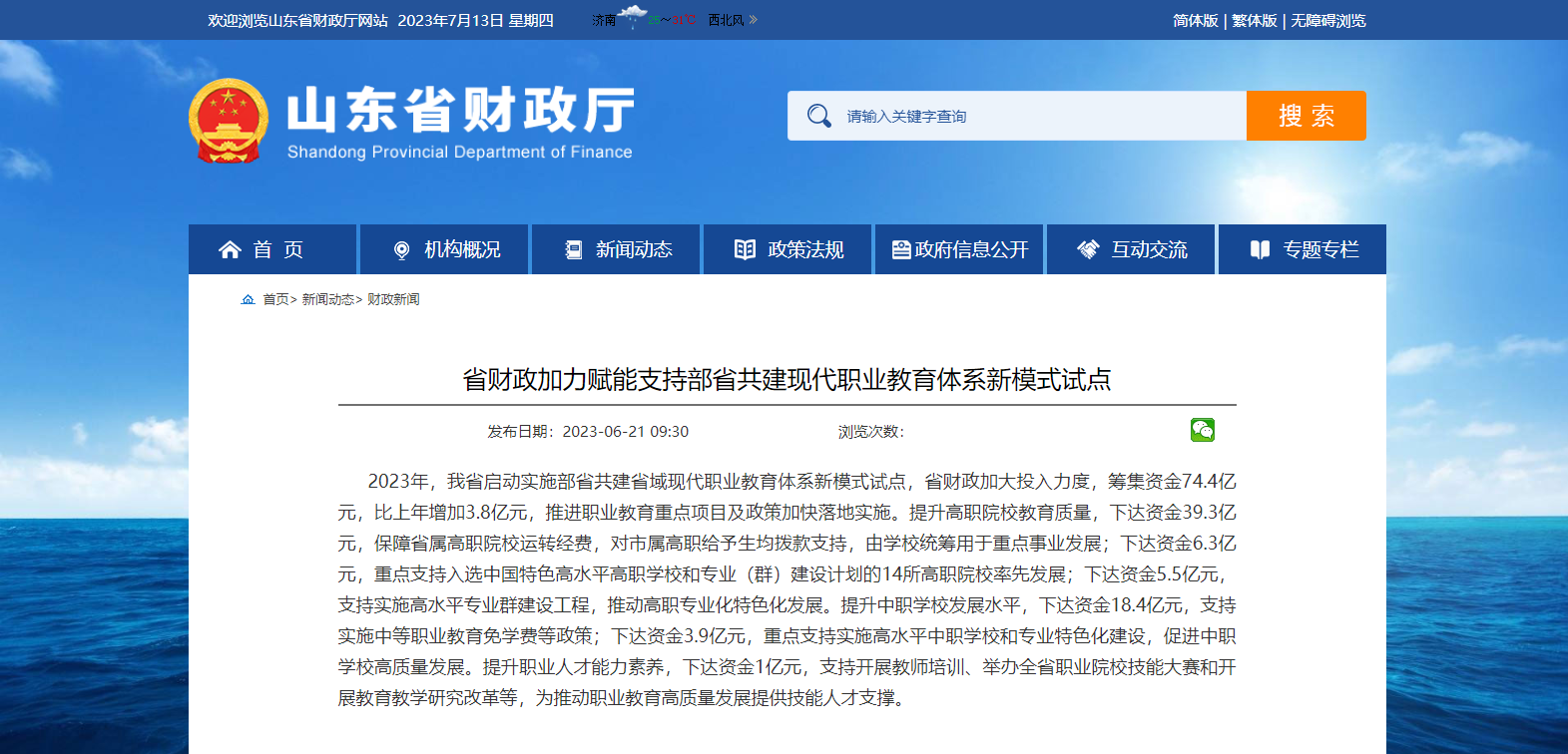 山東省財(cái)政廳官網(wǎng)發(fā)布,2023年,山東省啟動(dòng)實(shí)施部省共建省域現(xiàn)代職業(yè)教育體系新模式試點(diǎn),省財(cái)政加大投入力度,籌集資金74.4億元,比上年增加3.8億元,推進(jìn)職業(yè)教育重點(diǎn)項(xiàng)目及政策加快落地實(shí)施。提升高職院校教育質(zhì)量,下達(dá)資金39.3億元,保障省屬高職院校運(yùn)轉(zhuǎn)經(jīng)費(fèi),對(duì)市屬高職給予生均撥款支持,由學(xué)校統(tǒng)籌用于重點(diǎn)事業(yè)發(fā)展;下達(dá)資金6.3億元,重點(diǎn)支持入選中國(guó)特色高水平高職學(xué)校和專業(yè)(群)建設(shè)計(jì)劃的14所高職院校率先發(fā)展;下達(dá)資金5.5億元,支持實(shí)施高水平專業(yè)群建設(shè)工程,推動(dòng)高職專業(yè)化特色化發(fā)展。提升中職學(xué)校發(fā)展水平,下達(dá)資金18.4億元,支持實(shí)施中等職業(yè)教育免學(xué)費(fèi)等政策;下達(dá)資金3.9億元,重點(diǎn)支持實(shí)施高水平中職學(xué)校和專業(yè)特色化建設(shè),促進(jìn)中職學(xué)校高質(zhì)量發(fā)展。提升職業(yè)人才能力素養(yǎng),下達(dá)資金1億元,支持開(kāi)展教師培訓(xùn)、舉辦全省職業(yè)院校技能大賽和開(kāi)展教育教學(xué)研究改革等,為推動(dòng)職業(yè)教育高質(zhì)量發(fā)展提供技能人才支撐。